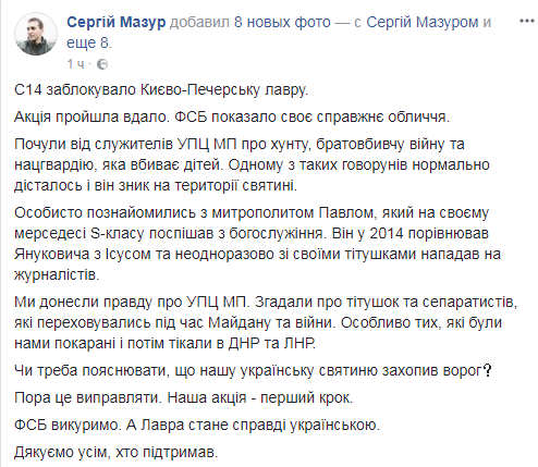 "Акция прошла удачно. ФСБ показало свое истинное лицо. Услышали от служителей УПЦ МП про хунту, братоубийственную войну и Нацгвардию, которая "убивает детей". Одному из таких говорунов нормально досталось и он исчез на территории святыни", – написал он.