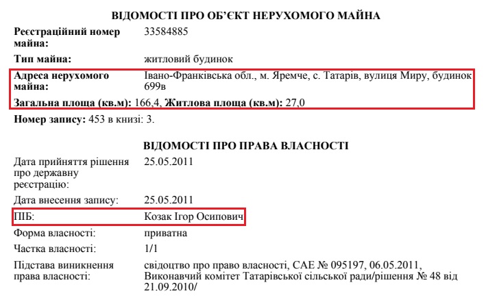 Ще один будинок площею 166 кв. м. перебуває у власності чоловіка Людмили Галіян та судді у відставці Ігоря Козака. Знаходиться він у туристичному селі Татарів за 13 км від гірськолижного курорту «Буковель».