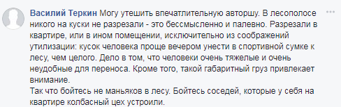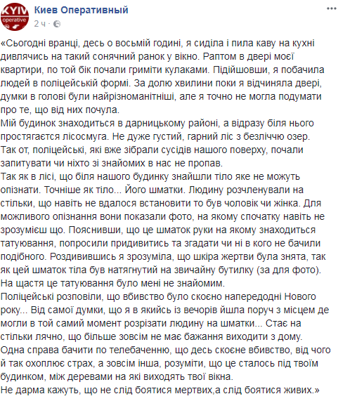 "Потому что в лесу, который возле нашего дома, нашли тело, которое не могут опознать. Точнее, куски тела. Человека расчленили настолько, что даже не удалось установить, был это мужчина или женщина", - отметила она.