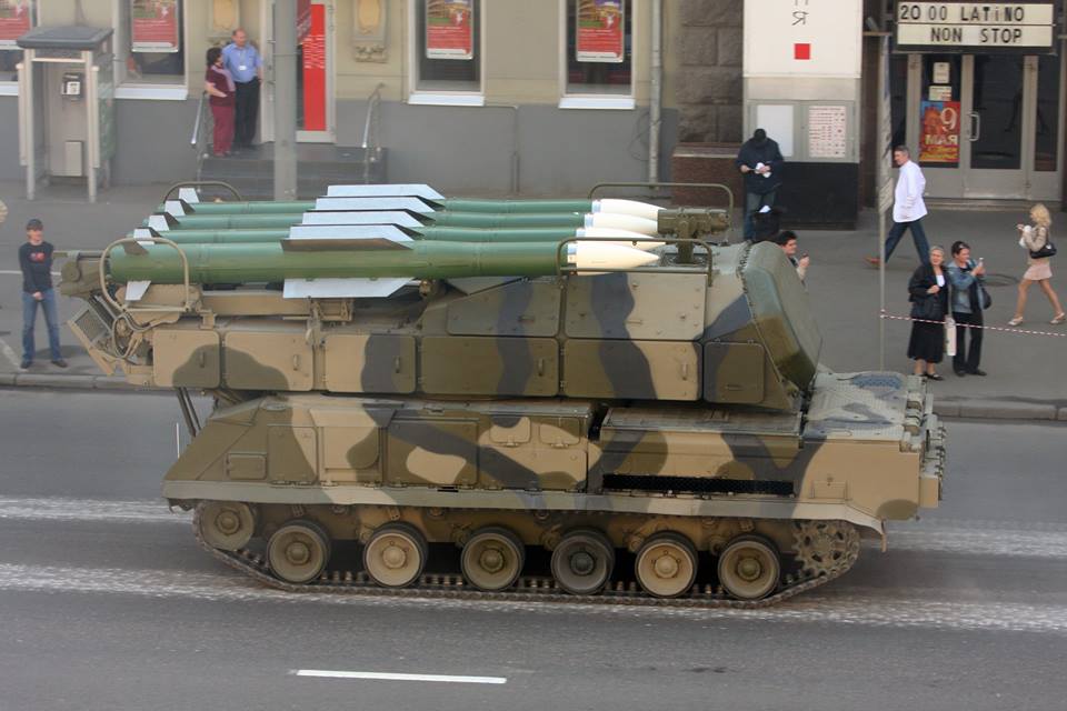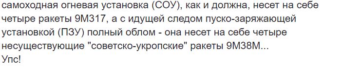 “И вот я смотрю свои фотографии военной техники с Парада Победы 9 мая 2008 года в Москве, на котором всему миру среди прочего демонстрировался зенитный ракетный комплекс "Бук-М2". Так вот, его самоходная огневая установка (СОУ), как и должна, несет на себе четыре ракеты 9М317, а с идущей следом пуско-заряжающей установкой (ПЗУ) полный облом: она несет на себе четыре несуществующие "советско-укропские" ракеты 9М38М… Упс!” - рассказал Лукашевич.