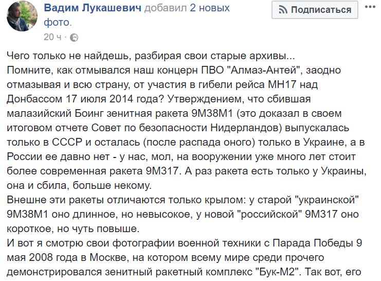 Ложь Кремля раскрыл пользователь Facebook из Москвы Вадим Лукашевич. Он напомнил, как российский госконцерн “Алмаз-Антей” самозабвенно лгал об отсутствии в РФ зенитной ракеты 9М38М1. Именно такой, согласно данным международной следственной группы, и был поражен пассажирский самолет в небе над Донбассом в июле 2014 года.