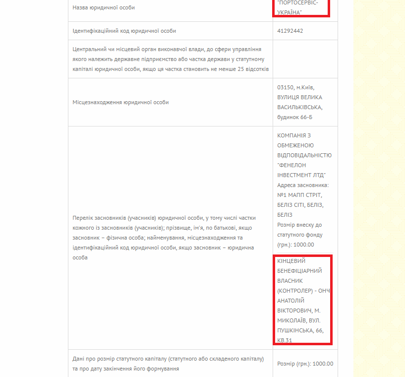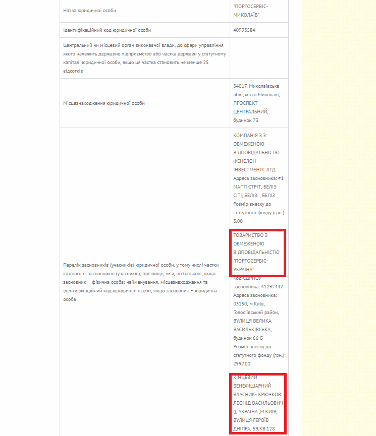 100% доля в капитале ООО «Портосервис-Украина» принадлежит белизскому оффшору Фенелон Инвестмент Лтд, бенефициаром которого компания называет своего директора Анатолия Онча. Впрочем, у «дочки» «Портосервис-Украина» — компании «Портосервис-Николаев» — другое видение. По ее данным, бенефициар ее материнской компании — киевский бизнесмен Леонид Крючков.