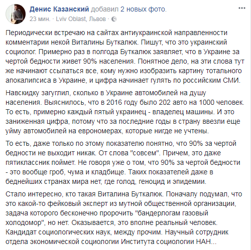"Периодически встречаю на сайтах антиукраинской направленности комментарии некой Виталины Буткалюк. Пишут, что это украинский социолог. Примерно раз в полгода Буткалюк заявляет, что в Украине за чертой бедности живет 90% населения. Понятное дело, на эти слова тут же начинают ссылаться все, кому нужно изобразить картину тотального апокалипсиса в Украине, и цифра начинает гулять по российским СМИ", – рассказал Казанский.