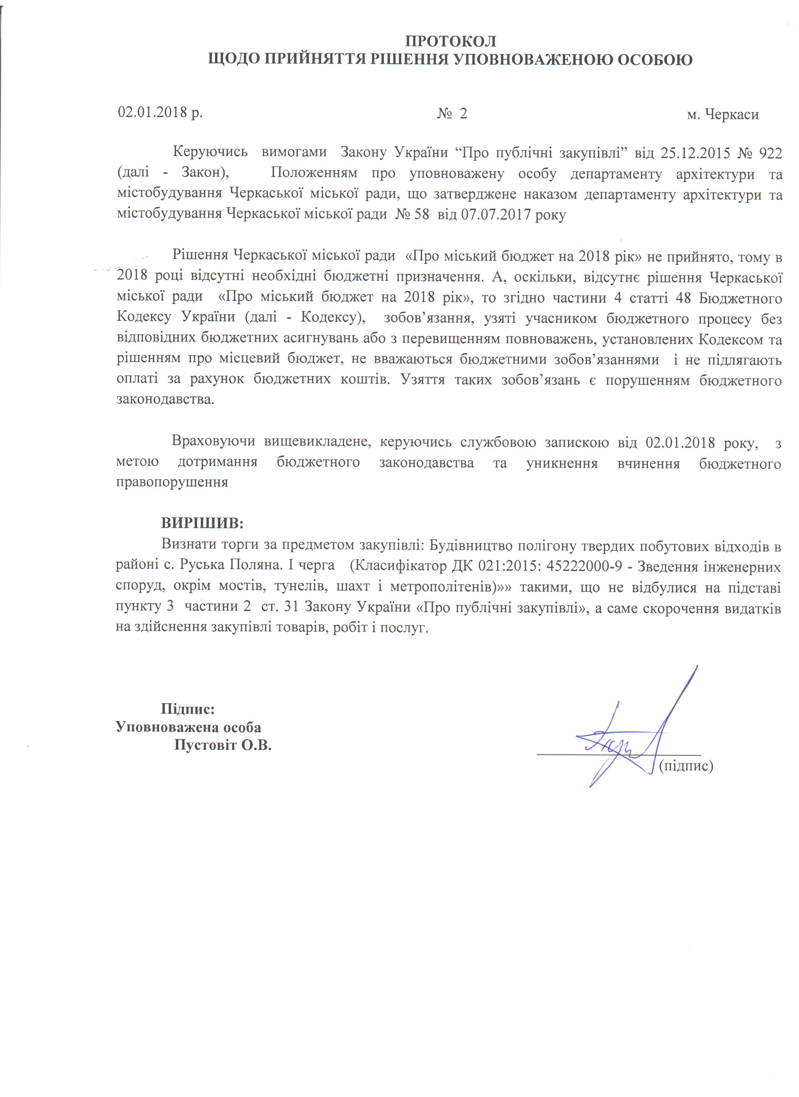 Аукціон відбувся восьмого грудня. У ньому взяли участь чотири товариства. Найменшу вартість робіт, 35 млн. грн., запропонувало ТОВ "Черкаське спеціалізоване управління 525". Але, оскільки міський бюджет на 2018 рік не прийнято вчасно, на полігон нема необхідних бюджетних призначень. Тож, ці торги визнали такими, що не відбулися.