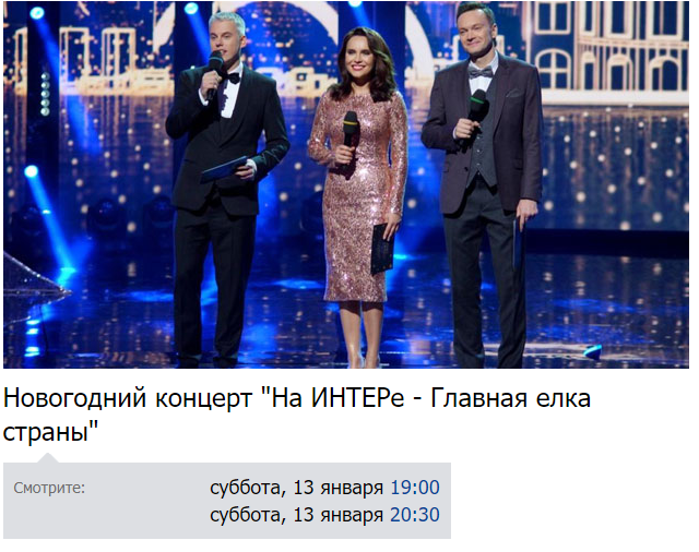Так, согласно телепрограмме, новогодний концерт "На ИНТЕРе - Главная елка страны" покажут на этих выходных три раза.