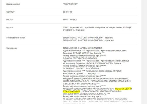 Так, наприклад, Овчарук Сергій є кінцевим бенефіціарним власником СВК “ЕКОПРОРДУКТ” у місті Христинівка.
