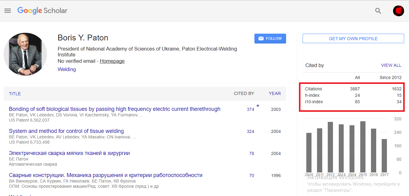 Так виглядає профайл академіка НАНУ Бориса Патона у програмі Google Scolar. З 1991-го року його цитували 3887 разів.