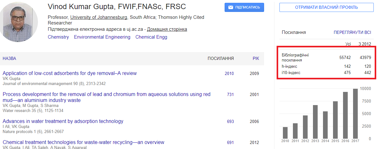 А це – сторінка професора Йоханесбургзького університету, Південна Африка. Індекс цитування Вінода Кумара в сім разів більший, ніж у Патона. Ми вибрали цей приклад випадковим чином із поміж тисяч учених з таким індексом.