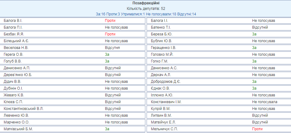 Еще три нардепа, проголосоваших "против", не состоят ни в одной из фракций. Это Павел и Виктор Балоги, а также Сергей Мельничук.
