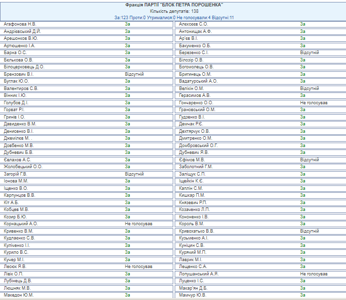 Больше всего голосов в поддержку законопроекта отдала фракция "Блок Петра Порошенко". "За" проголосовали 123 человек из 127 присутствоваших.