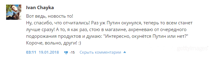 Недоверие Путин вызвал из-за возраста. "Скорей всего, в павильоне Мосфильма снимали. Главное - декорации, массовка. Не верю, что человек в 65 лет впервые в прорубь полезет", - написал один из пользователей.