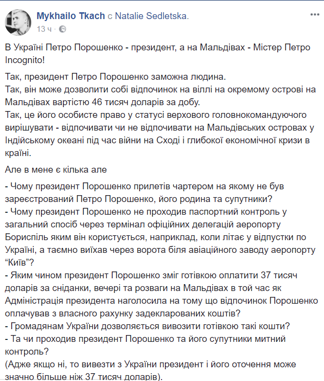 - Как президент Порошенко смог наличными оплатить 37 000 долларов за завтраки, ужины и развлечения на Мальдивах, в то время как Администрация президента отметила, что отдых Порошенко оплачивал из собственного счета задекларированных средств?