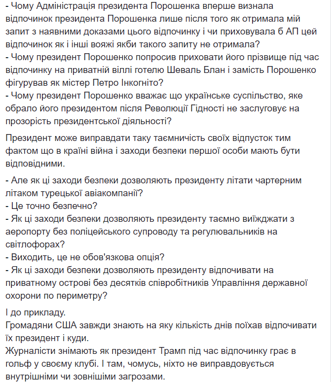 - Почему Администрация президента Порошенко впервые признала отдых президента Порошенко только после того, как получила мой запрос с имеющимися доказательствами этого отдыха и скрывала ли бы АП этот отдых, как и другие вояжи, если бы такого запроса не получила?