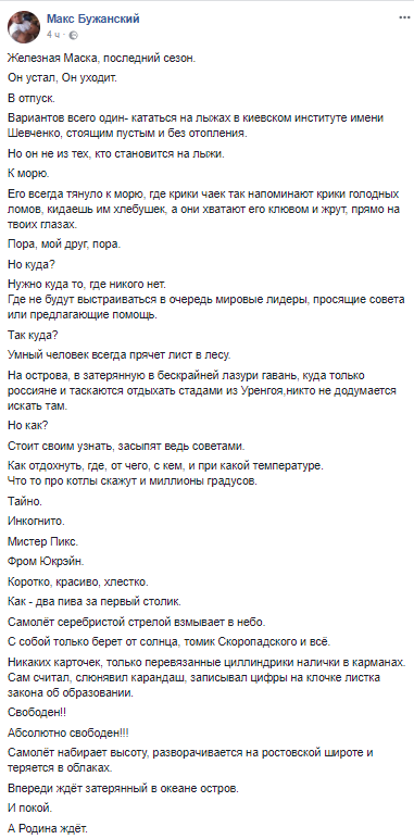 Блогер Макс Бужанский попытался проникнуть в душу гаранта, и, кажется, получилось – он написал целый киносценарий об отдыхе президента.
