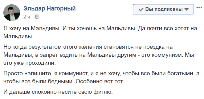 Но когда результатом этого желания становятся не поездка на Мальдивы, а запрет ездить на Мальдивы другим – это коммунизм. Мы это уже проходили.