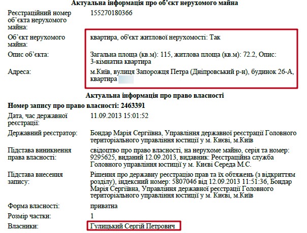 Як нам вдалось з’ясувати, подарована квартира до цього належала його батьку. Вона була приватизована ним ще у 2006 році. Але у декларації прокурора за 2014 рік вона відсутня. Серед задекларованих автомобілів у власності Сергія Гулицького — Acura MDX 2008 року, вказаною вартістю 208 тис. грн.