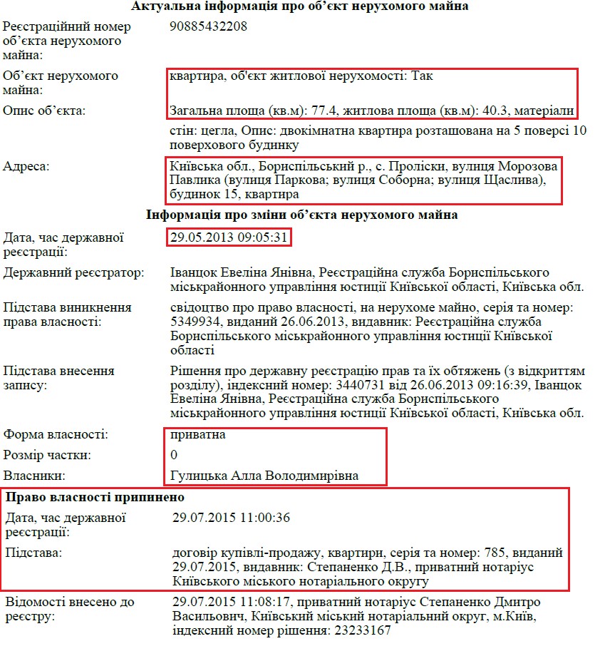 Але нам вдалось з’ясувати, що Алла Володимирівна ще у 2013 році набула у властність нову квартиру у с. Проліски під Києвом, площею 77 кв. м.