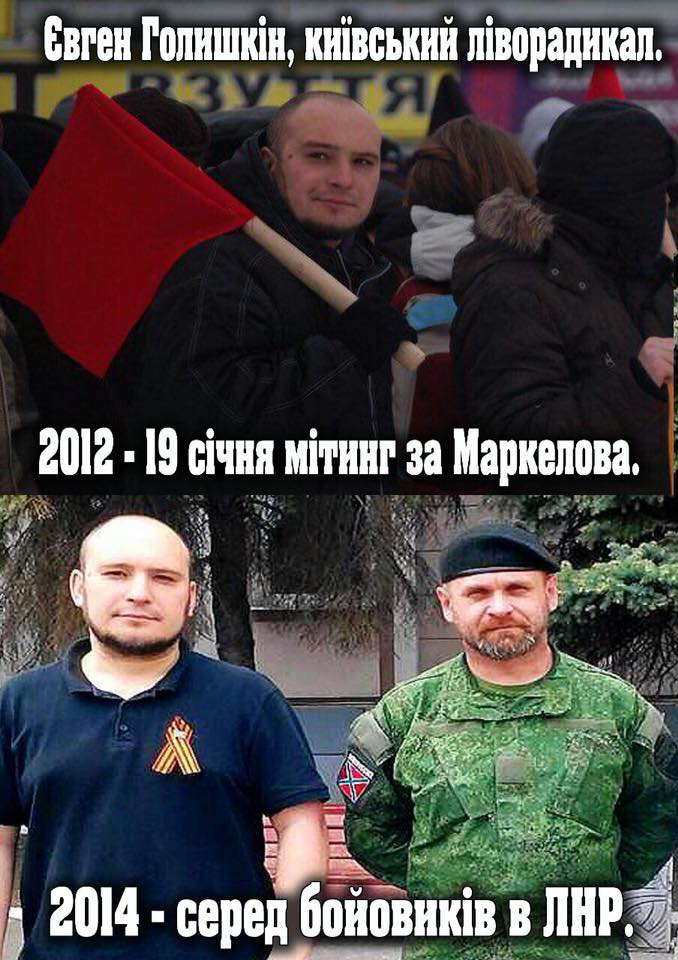 Рівно шість років тому ліворадикал Євген Голишкін марширував по Михайлівській площі з червоним прапором, а вже у 2014 році позував перед фотокамерою поруч з одним із лідерів «ЛНР» Олексієм Мозговим.