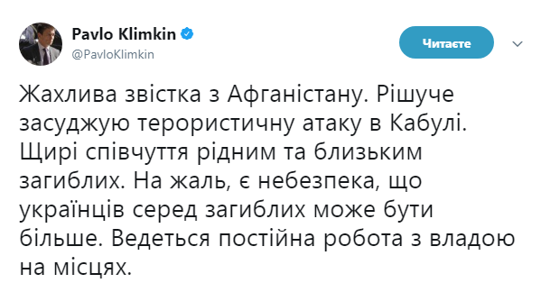 "Ужасная весть из Афганистана. Решительно осуждаю террористическую атаку в Кабуле. Искренние соболезнования родным и близким погибших. К сожалению, есть опасность, что украинцев среди погибших может быть больше. Ведется постоянная работа с властью на местах", - написал он в своем Twitter-аккаунте.