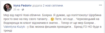 "Мэр от партии "Новые лица". Боярка. Черновецкий на Крещение, как клиент, отличился знатно... Теперь вот еще мэр Боярки...", - написала активистка Ирина Федорив в своем Facebook.