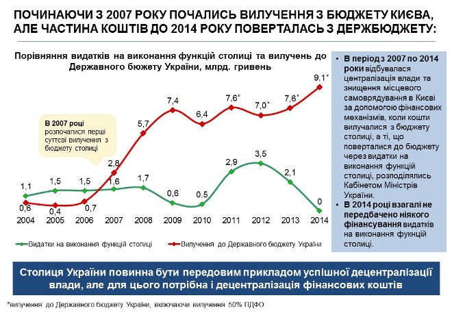На прошлой неделе Кабмин принял за основу норму об увеличении изъятий НДФЛ из городского бюджета столицы в пользу госбюджета с 50% до 75%. Так, если сейчас Киев отчисляет 8,5-9 млрд грн ежегодно, то теперь сумма изъятий по НДФЛ может составить 12,5-13 млрд грн. Коалиционное соглашение вроде бы декларирует децентрализацию власти, однако действия правительства в отношении Киева фактически делают невозможным выполнение столицей ее функций.