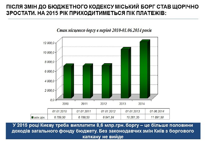 Из-за девальвации город теряет по сегодняшнему курсу 2,5 млрд грн, потому как в следующем году Киеву нужно гасить евробонды 2005 года, выпущенные на 250 млн долл. По курсу 8 грн за доллар долг к погашению был бы 2 млрд грн, сегодня это уже 4,5 млрд грн, а какой курс будет к ноябрю следующего года, когда наступает срок погашения – прогнозировать сложно.Следующий финансовый год для Киева будет критическим, ведь городу нужно будет погасить 1,9 млрд грн по облигациям, которые выпускались на покрытие разницы в тарифах. Еще 3,5 млрд грн внутреннего займа (2,6 млрд грн, которые “перепакованы” сейчас, и те, которые согласно планам город будет погашать в 2015 г.). Кроме того, 250 млн долл. по евробондам, выпущенным в 2005 г. В итоге сумма составит уже 9,9 млрд грн из общего фонда бюджета.