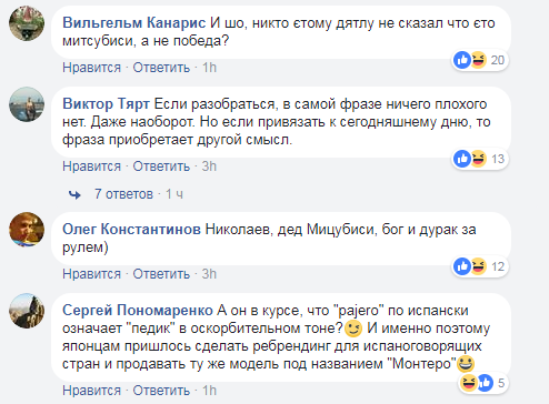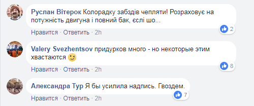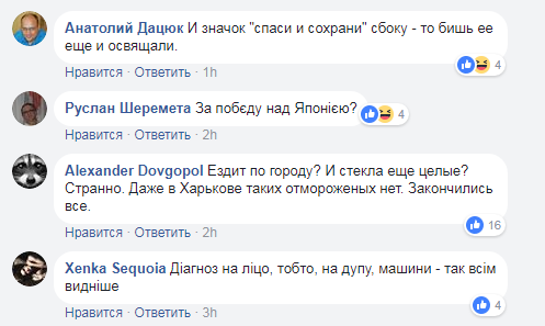 "Я бы усилила надпись. Гвоздем", "Придурков много - но некоторые этим хвастаются", "И с такой надписью у него еще целая машина и фейс? Странно", "За победу над Японией?" "Ездит по городу? И стекла еще целые?" - пишут комментаторы.