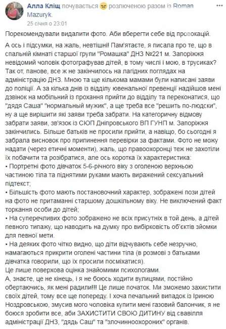 "Сьогодні дитина прийшла з дитячого садочку (5 років) і повідомила, що сьогодні їх фотографував якийсь "дядя Саша у зеленій футболці", фотографував на прогулянці, за обідом та в спальні!!! На резоне питання до вихователя було повідомлено, що на зміні її не було та вона не знає, що відбувається, телефону "дяді Саші" у вихователя не має. Опитування батьків показало, що ніхто не запрошував фотографа. В.о. зав. дитячого садка у телефонній розмові не змогла відповісти хто такий "дядя Саша", але завтра зможе відповісти. Я вислухаю та напишу заяву до поліції!!!!! Запоріжжя, ДНЗ №221", - написала она.