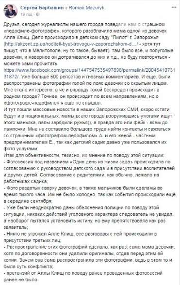 Барбашин написал, что он связался с "фотографом-педофилом", и считает, что журналисты раздули скандал зря. По его словам, фотосессия проходила с разрешения администрации садика, а разрешение родителей было "на совести работников садика".