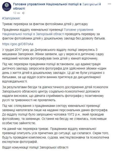 Сегодня, 27 января, пресс-служба запорожской областной полиции на своей странице в Фейсбук написала, что правоохранители проводят проверку.