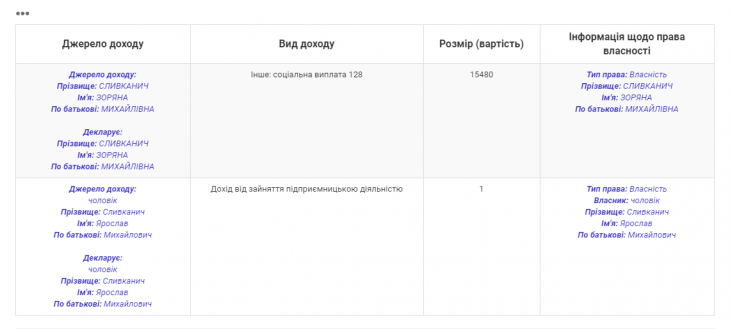 Втім, дружина підприємця Зоряна Сливканич, яка працює головним спеціалістом відділу ведення Державного реєстру виборців в Богородчанській РДА, в е-декларації за 2016 рік вказала річний дохід чоловіка одну гривню (!).