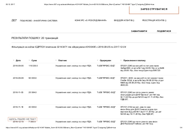 Як йдеться на сайті публічних закупівель ProZorro, 29 серпня 2016 року районне управління освіти замовило у ТОВ "Ярекс-Буд" поточний ремонт приміщення Заберезького навчально-виховного комплексу на суму 119 339 грн. Вже 2 вересня був складений акт про виконані роботи, і пройшла повна оплата. Звіт про укладений договір був опублікований 5 вересня, що є порушенням термінів, встановлених Законом "Про публічні закупівлі". Адже замовник мав оприлюднити на ProZorrо договір не пізніше ніж на наступний день після його укладання. Натомість зробив це після підписання актів виконаних робіт та розрахунків з підрядником.