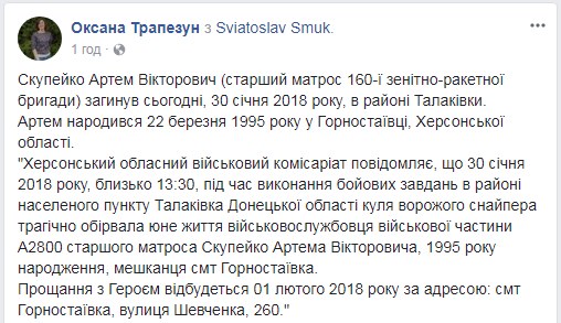 "Артем родился 22 марта 1995 года в Горностаевке Херсонской области. Херсонский областной военный комиссариат сообщает, что 30 января 2018 года, около 13:30, во время выполнения боевых задач в районе населенного пункта Талаковка Донецкой области пуля вражеского снайпера трагически оборвала юную жизнь военнослужащего военной части А2800, старшего матроса Скупейко Артема Викторовича", - рассказала она.