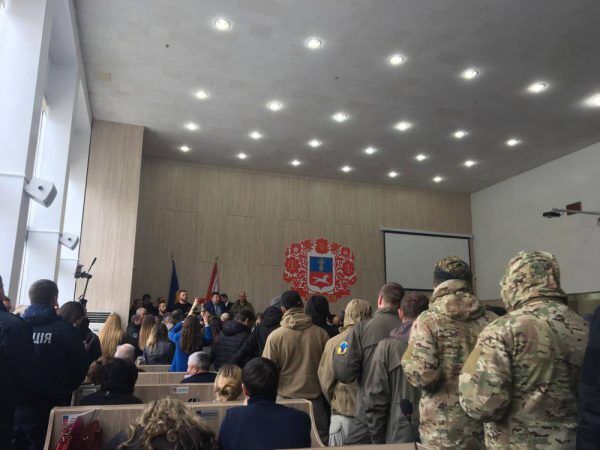 "На початку сесії в зал увійшла група молодиків у сіро-чорних формах із написами "Національна дружина" і чорних формах зі значками Національного корпусу "Азов". Всі вони були замотані шарфами або в балаклавах із капюшонами, а також із явними ознаками того, що у них є зброя (вони зайшли з такими сумками, які призначені для прихованого носіння зброї). Вони стали між рядами, забралися на трибуну, а їхній лідер Дмитро Кухарчук і колишній заступник мера Анатолія Бондаренка - Генадій Шевченко -розом із деякими АТОвцями, заблокували трибуни. При цьому Кухарчук вигукнув на весь зал: "Депутатів не випускати". Ось так почалася сесія", - розповів у коментарі "Обозревателю" депутат Черкаської міськради Олександр Згіблов.