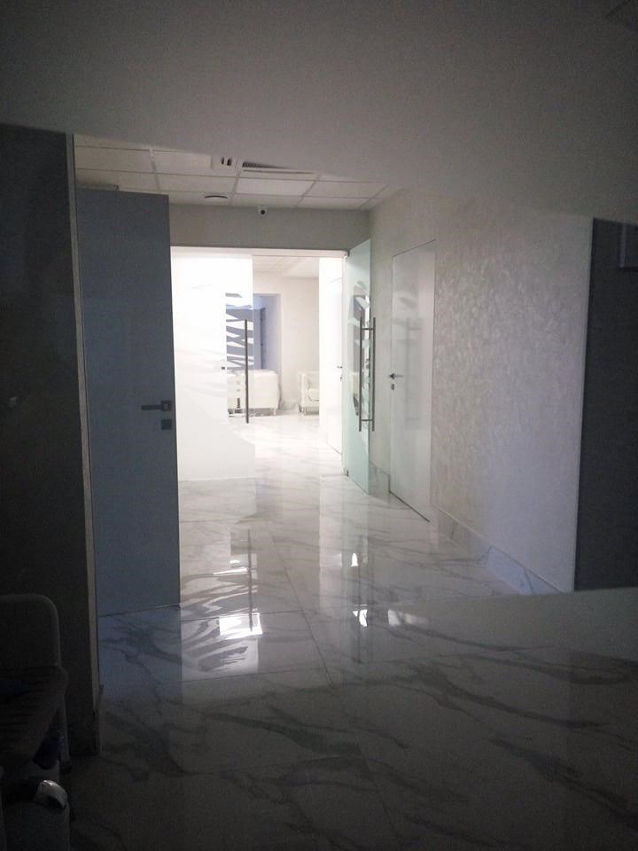 Что сказать... контраст удивительный. Выйдя из лифта, вы, если у вас есть деньги, попадете в медицинский оазис. Дверь к нему заметна сразу. Все сияет белизной и чистотой.