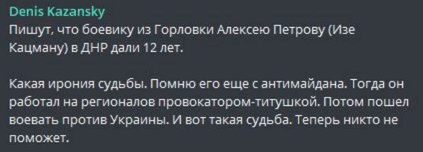 В террористической “ДНР” приговорили к 12 годам тюрьмы боевика с богатым сепаратистским прошлым Алексея Петрова, известного как “Изя Кацман”.