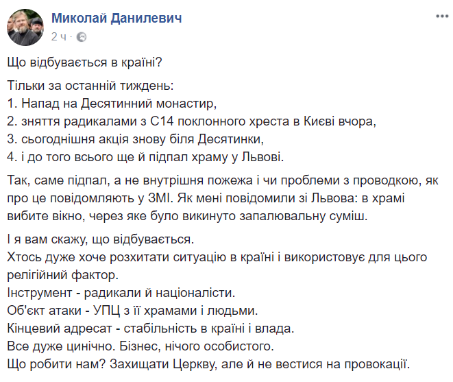 Представитель УПЦ Николай Данилевич рисует картину серьезного "наката" радикалов на церковь за последнее время.