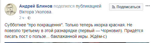 Так, журналист Андрей Блинов прокомментировал публикацию Уколова так: "Субботнее "про покращення". Только теперь икорка красная. Не повезло третьему в этой разнарядке (первый — Чорновил). Придется писать пост о пользе... баклажанной икры. Ждем-с)".