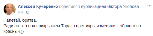 Экс-министра ЖКХ Алексея Кучеренко предлагает: "Налетай, братва. Ради агента под прикрытием Тараса цвет икры изменили с черного на красный".