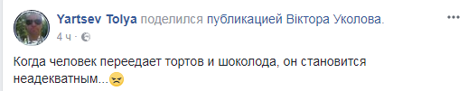 "Когда человек переедает тортов и шоколада (видимо, имеется в виду Roshen – кондитерский бизнес президента. – Ред.), он становится неадекватным", – считает пользователь Yartsev Tolya.