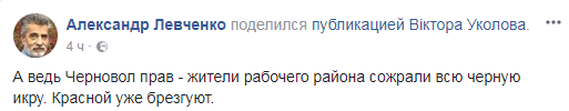 "А ведь Черновол прав – жители рабочего района сожрали всю черную икру. Красной уже брезгуют", – иронизирует Александр Левченко.