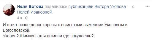 Киевлянка Неля Ботова пишет: "И стоят возле дорог коровы с вымытыми выменями Уколовым и Богословской. Уколов? Шампунь для вымени где покупаешь?"