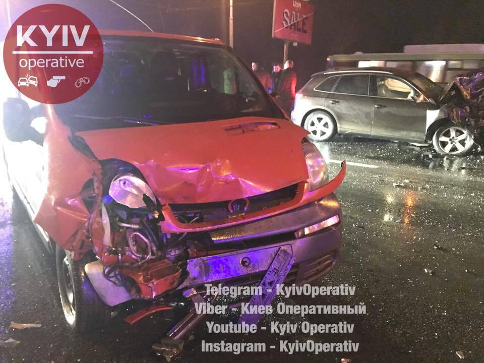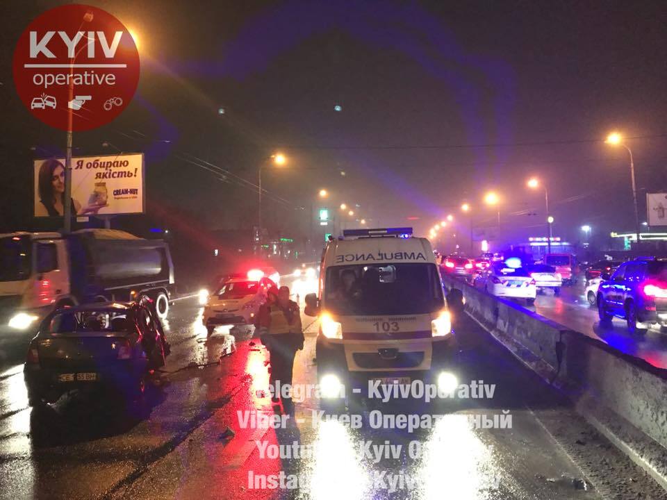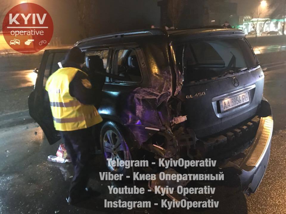 "Сегодня, приблизительно в 00:00, на проспекте Шухевича, сразу за Московским мостом (в сторону Троещины) произошла серьёзная авария. По предварительной информации, водитель автомобиля Mercedes, номер AA5956PH, выехал на проспект Шухевича против движения. Это увидели инспектора патрульной полиции и начали за ним погоню. Проехав несколько сотен метров, водитель Mercedes на огромной скорости въехал "лоб в лоб" в Dacia, которого через отбойник выбросило на встречную.