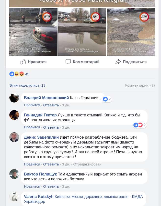 «Шановна Комунальна корпорація «Київавтодор» та Київська міська державна адміністрація — КМДА, а також прошу звернути увагу Виталий Кличко!