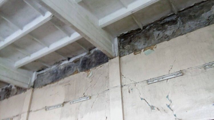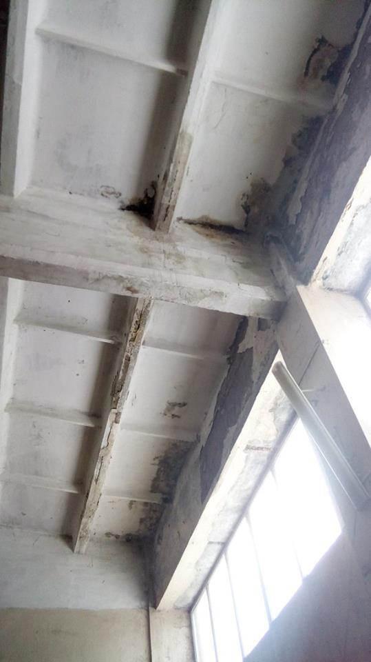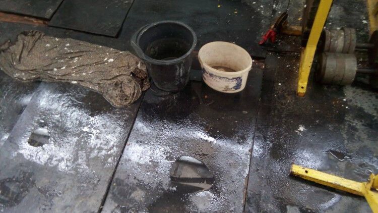 Потолок в спортивном зале сильно протекает, на полу образовались огромные пятна, поэтому используются емкости и тряпки для сбора воды, которая льется сверху.