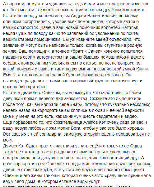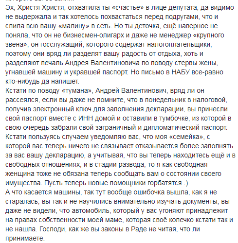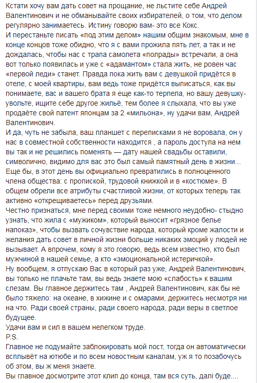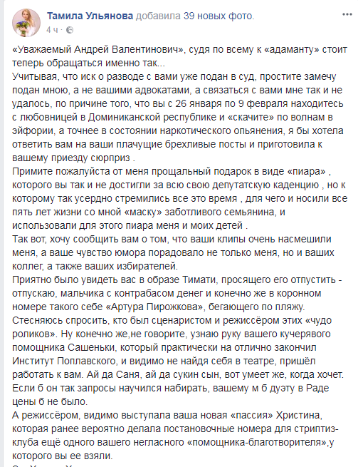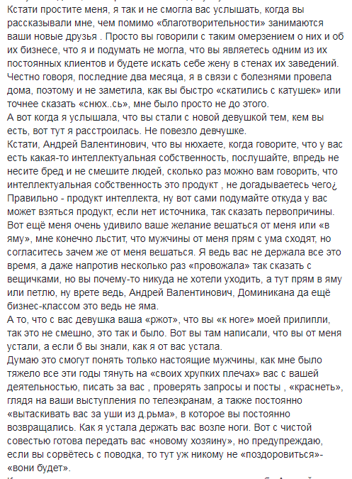 "Уважаемый Андрей Валентинович", судя по всему к "адаманту" стоит теперь обращаться именно так. Учитывая, что иск о разводе с вами уже подан в суд, простите замечу подан мною, а не вашими адвокатами, а связаться с вами мне так и не удалось, по причине того, что вы с 26 января по 9 февраля находитесь с любовницей в Доминиканской республике и "скачите" по волнам в эйфории, а точнее в состоянии наркотического опьянения, я бы хотела ответить вам на ваши плачущие брехливые посты и приготовила к вашему приезду сюрприз", – написала адвокат.