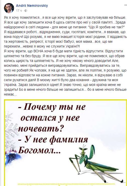 До этого, сам Немировский написал слезливый пост на своей странице в Facebook.