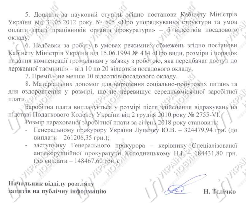 Об этом говорится в ответе Генпрокуратуры на запрос "Украинских Новостей". Оклад Луценко составил 37 тыс. гривен.