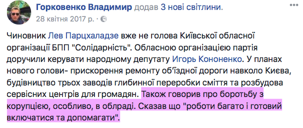 Як нагадує Резонанс, перший заступник голови депутатської фракції БПП І. Кононенко торік у квітні очолив терорганізацію партії у Київській області. Повідомлялось, що серед пріоритетів роботи новообраний керівник назвав "боротьбу з корупцією, особливо, в облраді".
