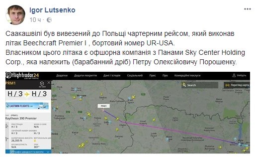 "Саакашвили был вывезен в Польшу чартерным рейсом, который выполнил самолет Beechcraft Premier I, бортовой номер UR-USA. Владельцем этого самолета является оффшорная компания из Панамы Sky Center Holding Corp., которая принадлежит (барабанная дробь) Петру Алексеевичу Порошенко", – написал он.